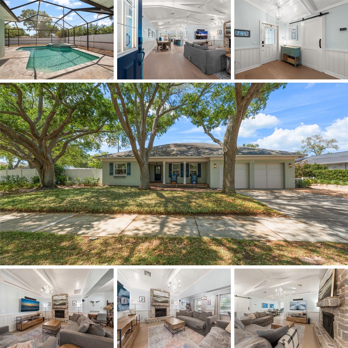 Perfectly positioned on a generous corner lot in the heart of Belleair, this move-in ready home blends timeless charm with modern comfort. Majestic oaks frame the inviting front porch, setting the tone for the light-filled interior where neutral wide-plank flooring, gorgeous shiplap and striking beamed ceilings create warmth and character throughout. An open, airy floor plan centers around a show-stopping kitchen featuring a massive island, apron-front sink, stainless steel appliances, and effortless flow into the family room with a cozy fireplace—ideal for everyday living and entertaining. Sliders open to a private, fenced backyard oasis complete with a screened patio, sparkling pool, and spa. The desirable split-bedroom layout offers a spacious primary retreat with beamed and shiplap ceilings, and a charming ensuite with a clawfoot tub, walk-in shower, and convenient pool bath access. Additional bedrooms are equally bright and inviting, sharing a beautifully updated hall bath with custom vanity and designer tile. A large laundry room, impact windows and doors, and a whole-house generator add peace of mind, all just moments from two private golf courses, boutique shopping, dining, parks, and the area’s renowned beaches.
